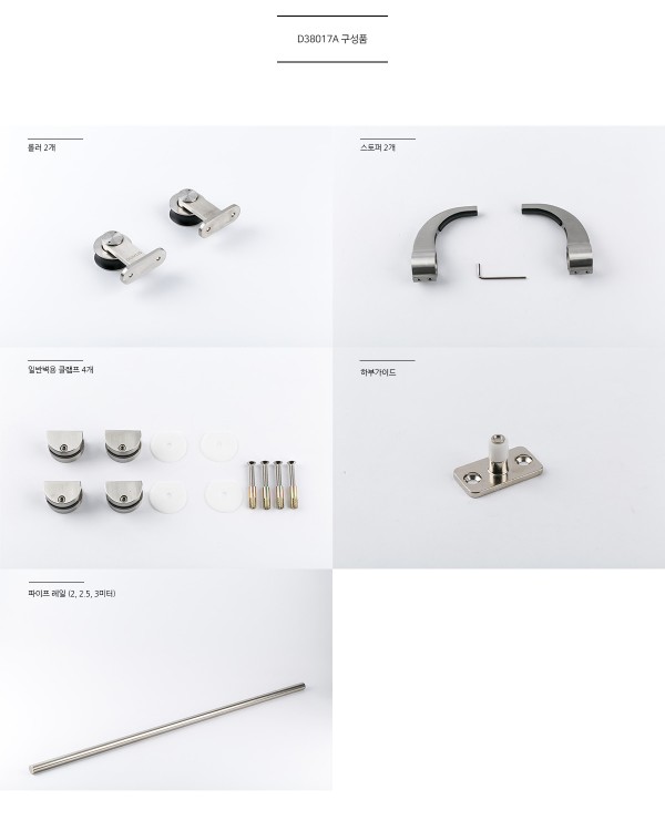 D38017A세트 일반벽용(2M,2.5M,3M) 관련링크 목록 본문 MODEL도무스 노출형 슬라이딩 시스템 D38017ADOMUS SLIDING DOOR SYSTEM D38017A INFORMATION제품명 : 도무스 노출형 슬라이딩 시스템 D38017A (일반벽용)재질 : 스테인리스 스틸색상 : 스텐 헤어라인최대 하중 : 80KG 구성품은 내부 사정에 의해 변경될 수 있습니다.촬영 환경 및 화면 해상도, 조명에 따라 이미지와 실제 제품의 색상에 차이가 있을 수 있습니다. DRAWING도면 이전 다음